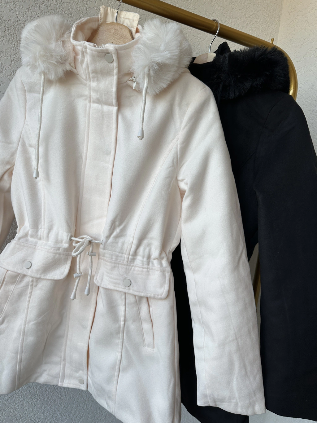 Parka de Lã Batida, peluciada por dentro, possui capuz removível, ajuste na cintura, zíper e botões invisíveis